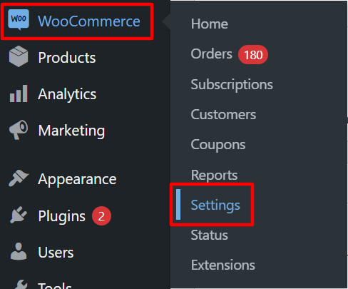 - From your WooCommerce admin panel on the left side, navigate to WooCommerce -> Settings.