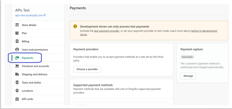 - Choose our plugin by Navigating to Settings -> Payments -> Third-party payment providers from your Shopify store admin panel.