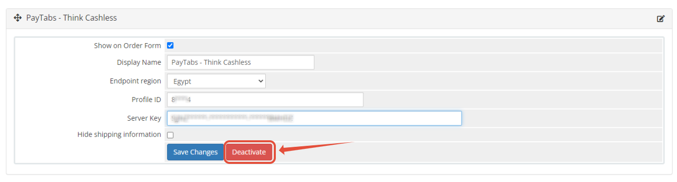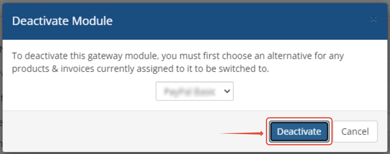 Note that deactivating Paytabs Payment Gateway Module requires switching to another module, Make sure to tap on the deactivate button after selecting the alternative module. As the above screenshot