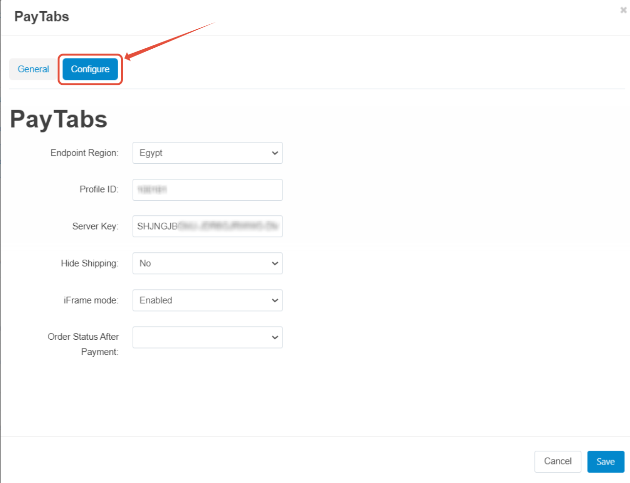 - The payment method will pop-up an edit form window, then select Configure tab.