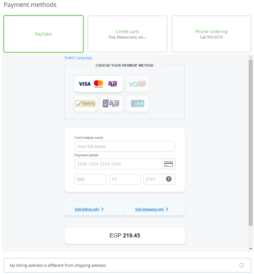In this article, we will walk you through how to manage the frame/embed mode on your website/store's checkout page, so that you can display our hosted payment page within your same checkout page without redirecting the customer to the PayTabs external payment page, as shown below. Kindly follow the below steps to know how to manage this configuration option: