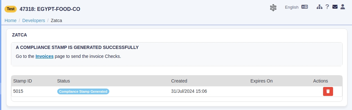 Once all the 3 invoices have been checked and passed successfully, go to Developers Tab > Zatca > you will find the status changed to "Compliance Check Passed"