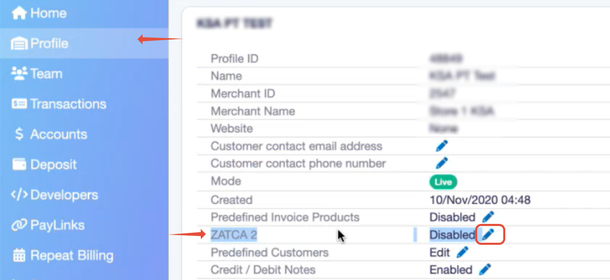 - Go to Profile menu from your PayTabs dashboard > navigate to "Zatca2" option > click on the edit (Pen Icon) > Click on "Enabled" button from inside the page > then click Save.